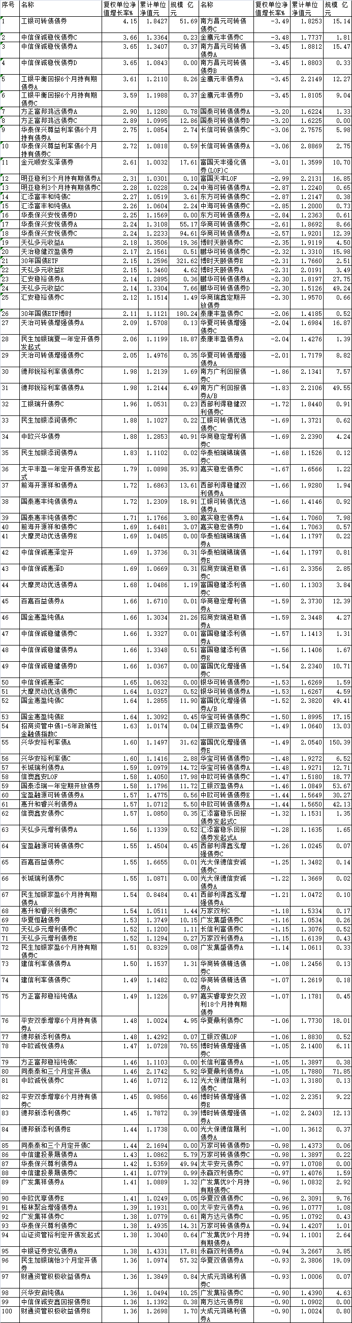 中国经济网北京11月6日电(记者康波)去年10月,业绩可比的7419只债券基金(每只股票单独计算,下同)中,剔除净资产发生变化的债券基金,共有6837只业绩好转,占比92%。另有39只个股持平,543只个股下跌。从收益榜来看,工银转债以4.15%的回报率位居第一,成为10月份唯一一只涨幅超过4%的债券基金。三季报显示,工行可转债占固定收益资产的61%,其中可转债占比80%,其次是国债。同时权益类资产占比37%,债券前五名分别为G三峡EB2、工业转债可债、上海银行转债、南方航空可转债、25国债08。持股前10名均为航空公司、券商等低估值股票,包括南方航空、国航、春秋航空、东方航空、吉祥航空、太保、中华航空、实业股等。价值观、东方价值观和中信价值观。该基金现任管理人为黄世元。资料显示,黄士元先生于2013年加入工银瑞信,现任养老金投资中心高级研究员、可转债基金经理。自2021年9月6日起担任基金经理。 黄士元、陆岩共同管理的工银A平衡收益6个月持有债和工银C平衡收益6个月持有债10月也分别上涨3.61%和3.59%。三季报显示,该基金主要资产为国债和金融债。排名前五的债券分别是25国债08、25国债13、25国债01、21邮储银行永续债01和20浦发银行永续债。少数资产也主要是航空股。涨幅最大的有中信信诚文悦债C、中信信诚文悦债A、中信保诚文悦债D、方正富邦宏源债A、方正富邦宏源债C、华泰宝兴遵义利息债6个月持有债A。华泰宝兴遵义利息债与C债等债基一样,已持有6个月,并已盈利。 10月份分别为3.66%、3.65%、3.65%、2.90%、2.89%、2.75%和2.72%。从跌幅名单来看,10月份共有11只债券基金跌幅超过3%。以金鹰元丰债为例,A/D股下跌3.45%,C股下跌3.48%。基金经理林龙军曾任投资基金产品经理、研究员、助理基金经理兴全基金管理有限公司基金经理、债券投资委员会委员。2018年3月加入金鹰基金管理有限公司,2018年5月起担任基金经理,拥有7年以上管理经验。从三季报来看,金石源丰的固定收益资产占比接近80%,其中大部分为可转债。主要维持红利的五只分别是汉宇转债、华安转债、新鑫转债、新23转债和冠宇转债。排名前十的龙头股分别为寒武纪、数据港、大智慧、富士城科技、一方生物、英维克、中基旭创、阿创创、协创数据、凯光信息。中海转债A、东转债C、中海转债C、东转债A等的债基也在10月份分别下跌2.87%、2.87%、2.85%和2.84%。东方转债加盟由杨贵斌先生、徐傲谦先生管理。其中,杨贵斌先生是一位拥有九年管理经验的资深人士。曾任富国基金管理有限公司固定收益研究员、基金经理,上海海通证券资产管理有限公司首席投资官、固定收益首席投资官、总经理助理。2019年9月加入东方基金管理有限公司,担任副总经理、固定收益首席投资官、公开投资决策委员会副主任。此前,他曾担任该公司副首席执行官,目前担任基金经理。徐傲前先生还拥有近四年的管理经验。 2025年10月固定收益基金百强数据来源:Flash(规模截止日期:2025年9月30日)