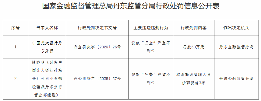 Everbright银行丹东分行因强奸而被罚款,由于贷款的“三项调查”,因此非常不足